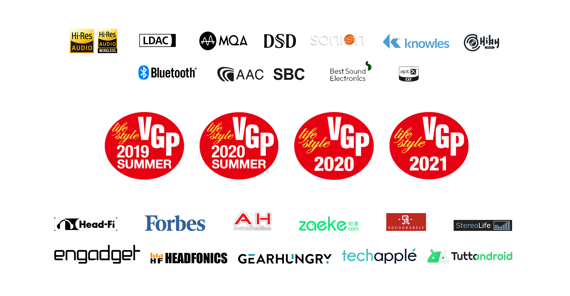 Hidizs products have garnered several prestigious professional certifications, including Japan Hi-Res Audio, Hi-Res Audio wireless, Sony LDAC, and MQA. Additionally, our dedication to excellence has been recognized by winning the VGP Golden Prize for three consecutive years (2019, 2020, 2021). Notably, Hidizs's renowned classics, the AP80 & AP80 Pro, secured a remarkable 7th place at the Yearly Best Earphones Sales Award in Japan from 2018 to 2021.