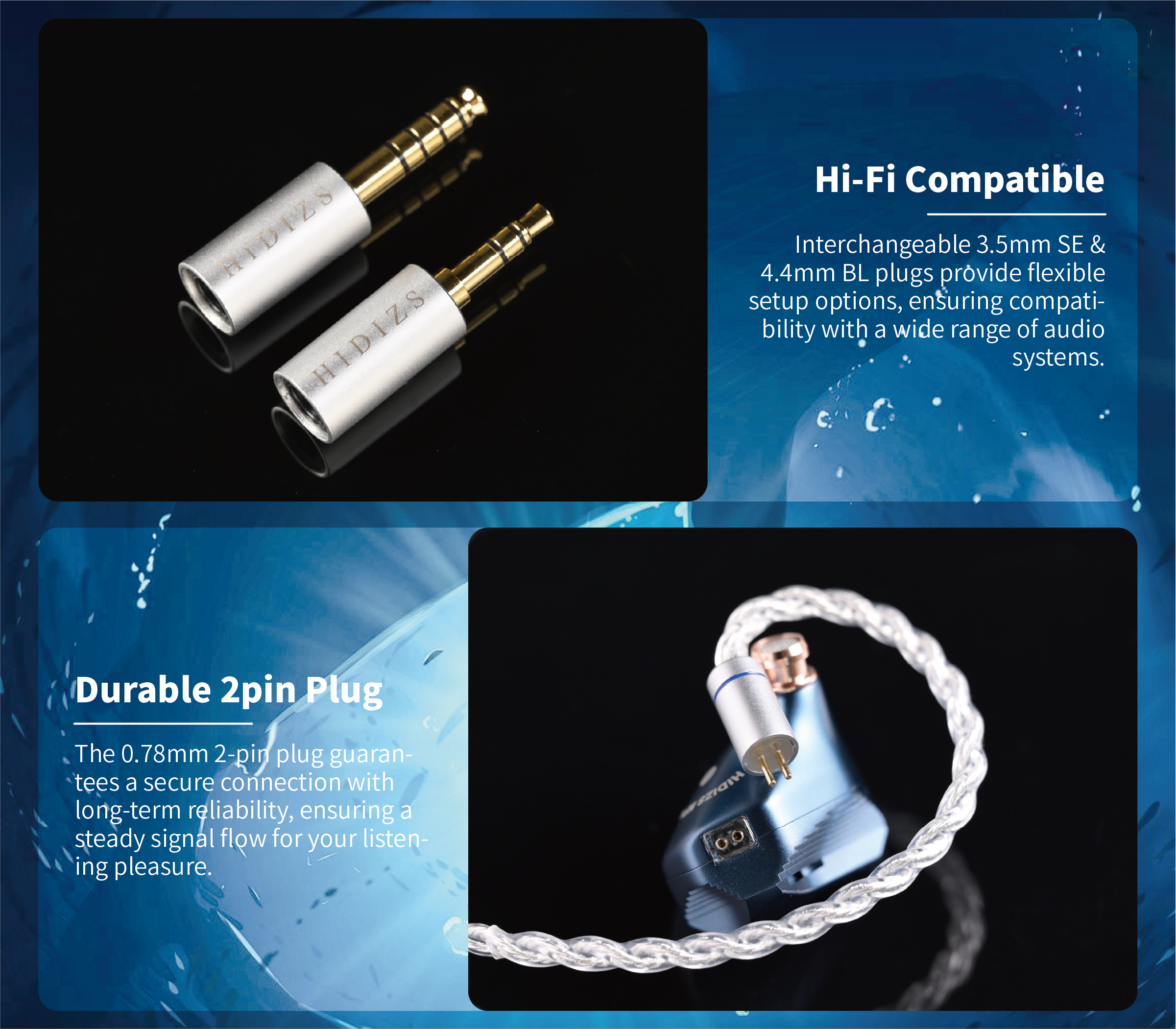 Higher hardness cable, interchangeable 3.5mm & 4.4mm plugs, and premium ‘Sea Anemone’ silicone eartips for enhanced comfort and sound isolation.