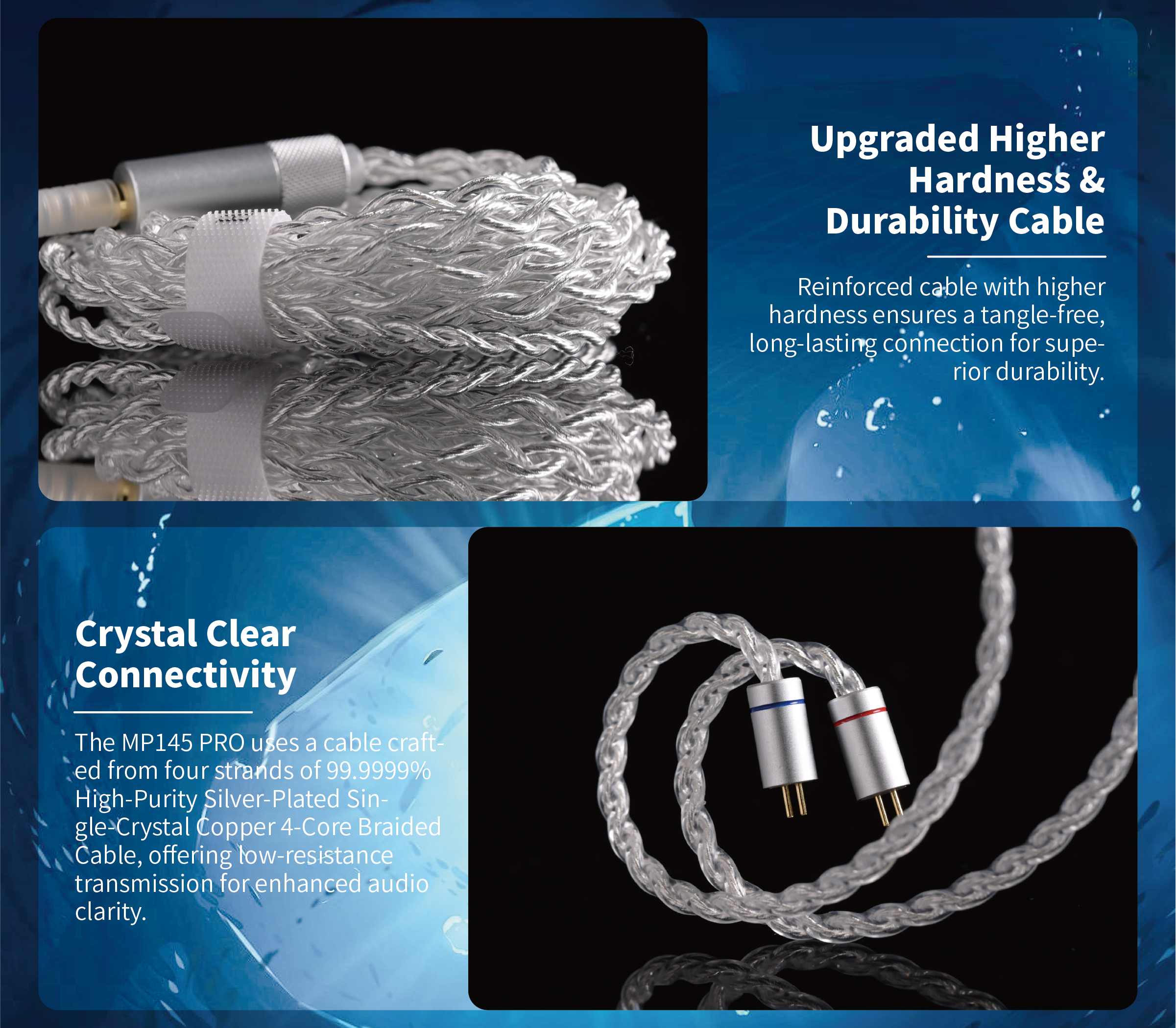 The MP145 PRO uses a cable crafted from four strands of 99.9999% high-purity single-crystal oxygen-free copper with a silver-plated surface, offering low-resistance transmission for enhanced audio clarity.