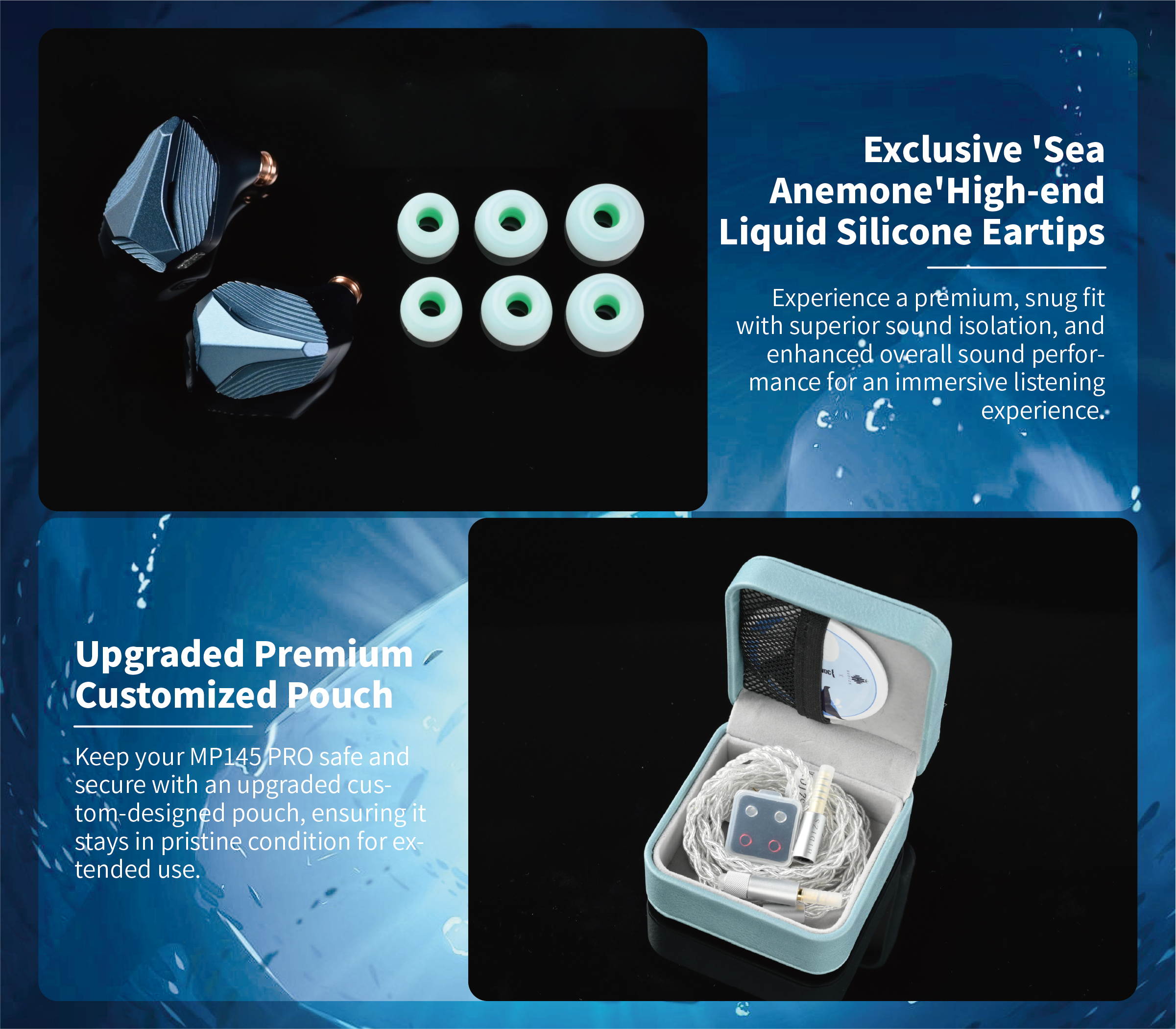 In addition to regular eartip sizes, the MP145 PRO includes high-end liquid silicone eartips, ensuring a comfortable, snug fit, superior sound isolation, and enhanced overall sound performance for an immersive listening experience.